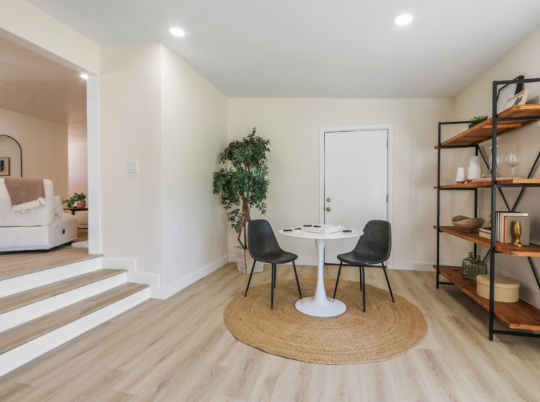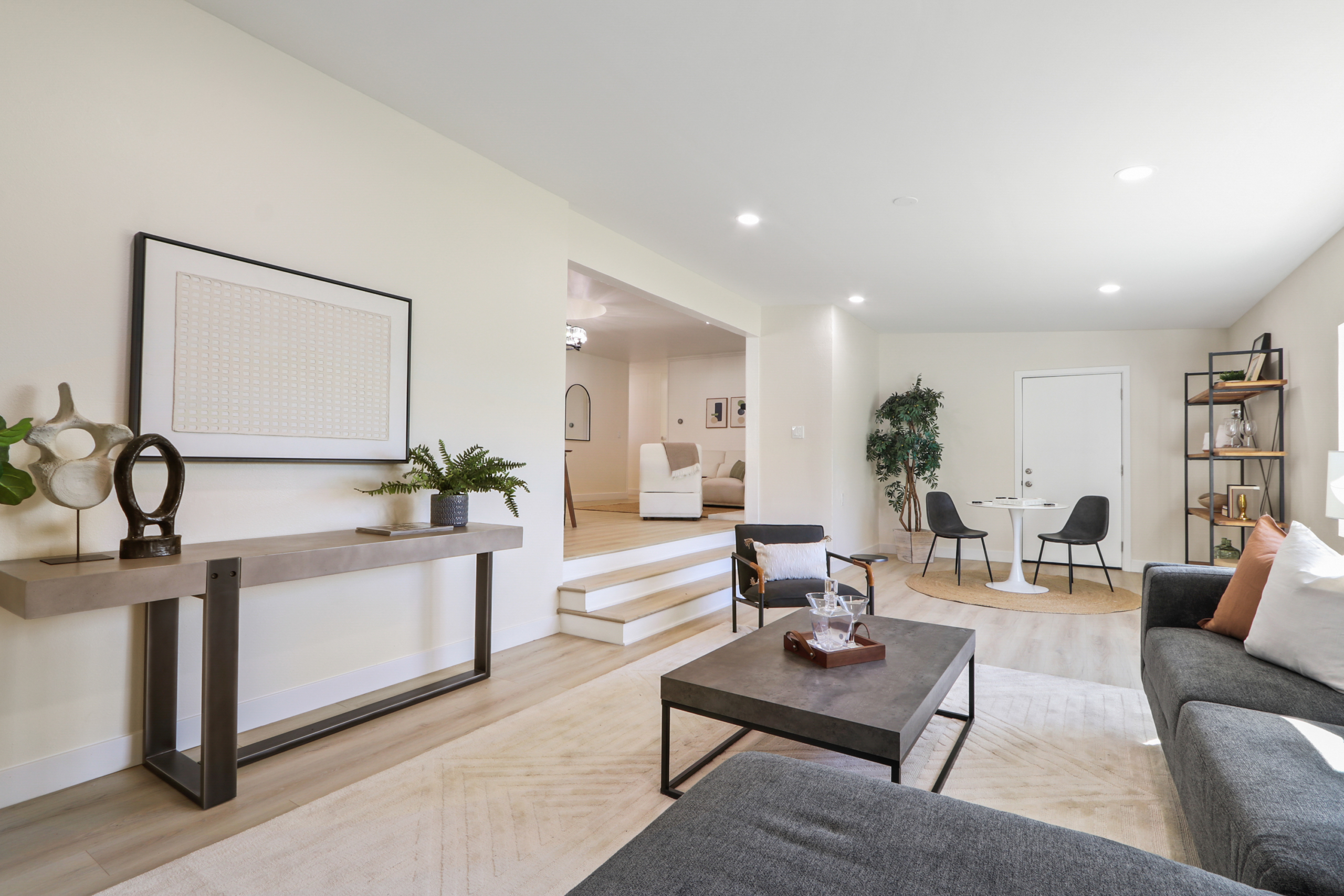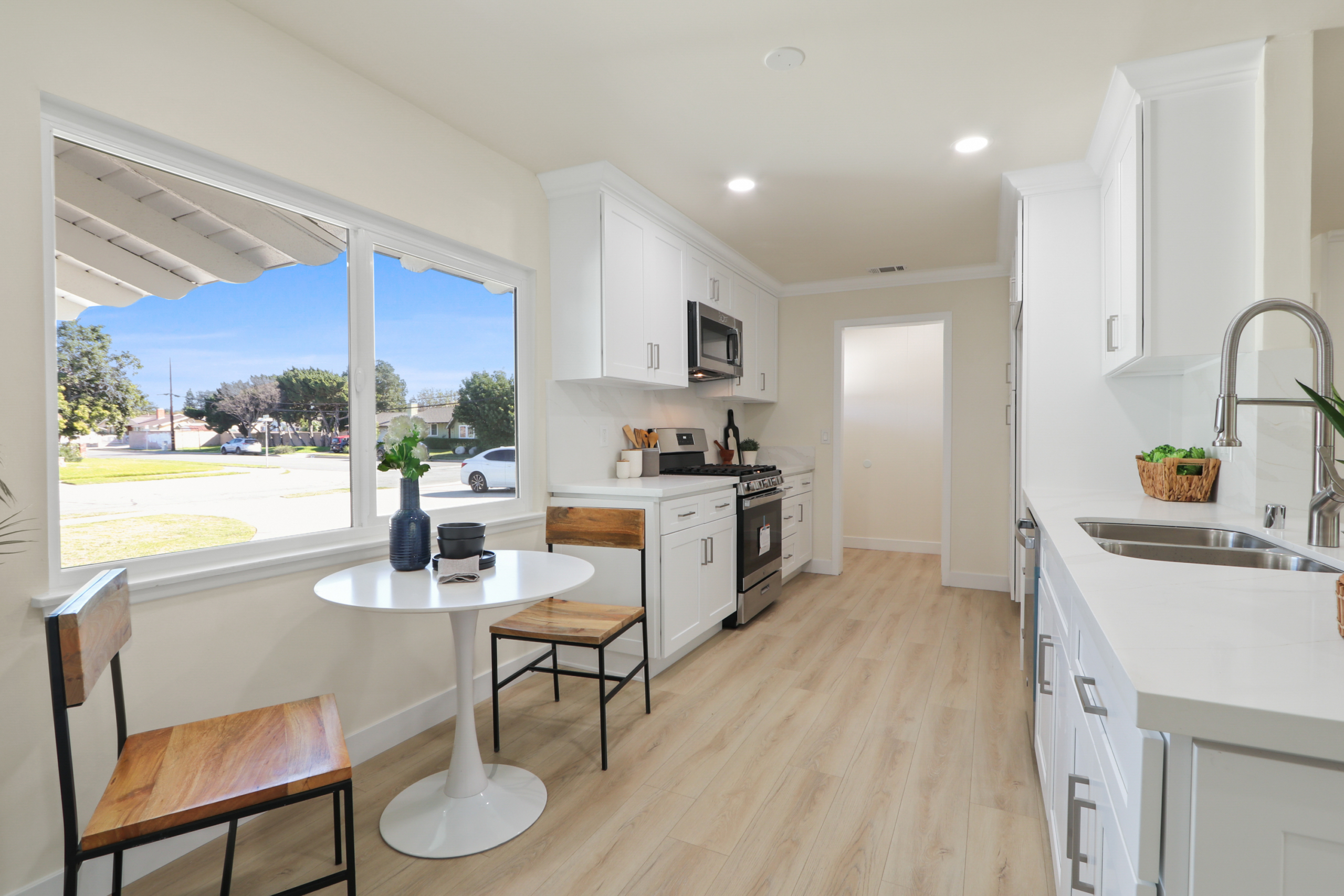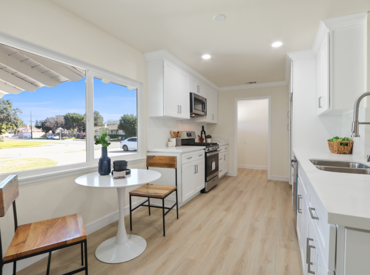 open floor plan, an upgraded kitchen with new cabinets, quartz countertops, and appliances, tastefully remodeled