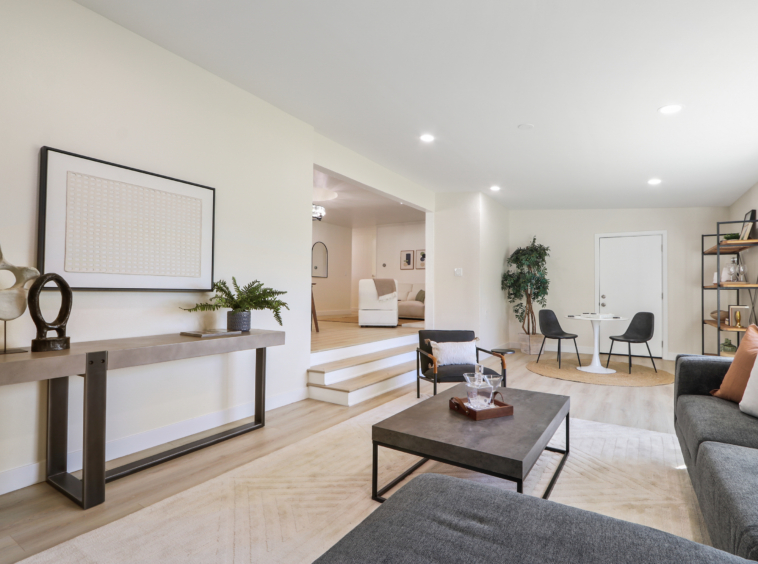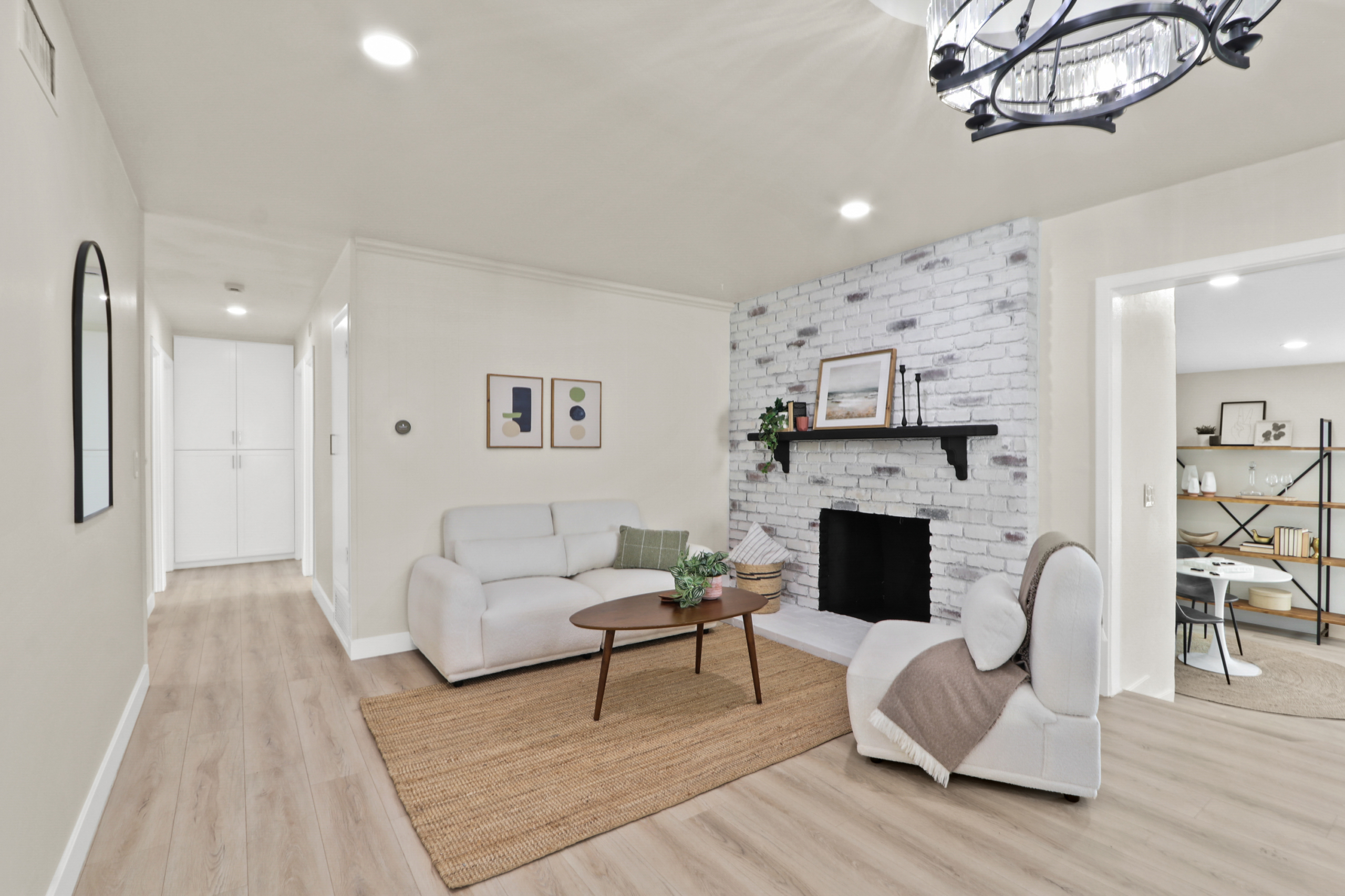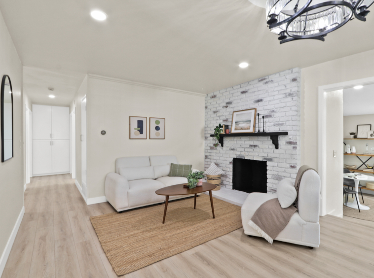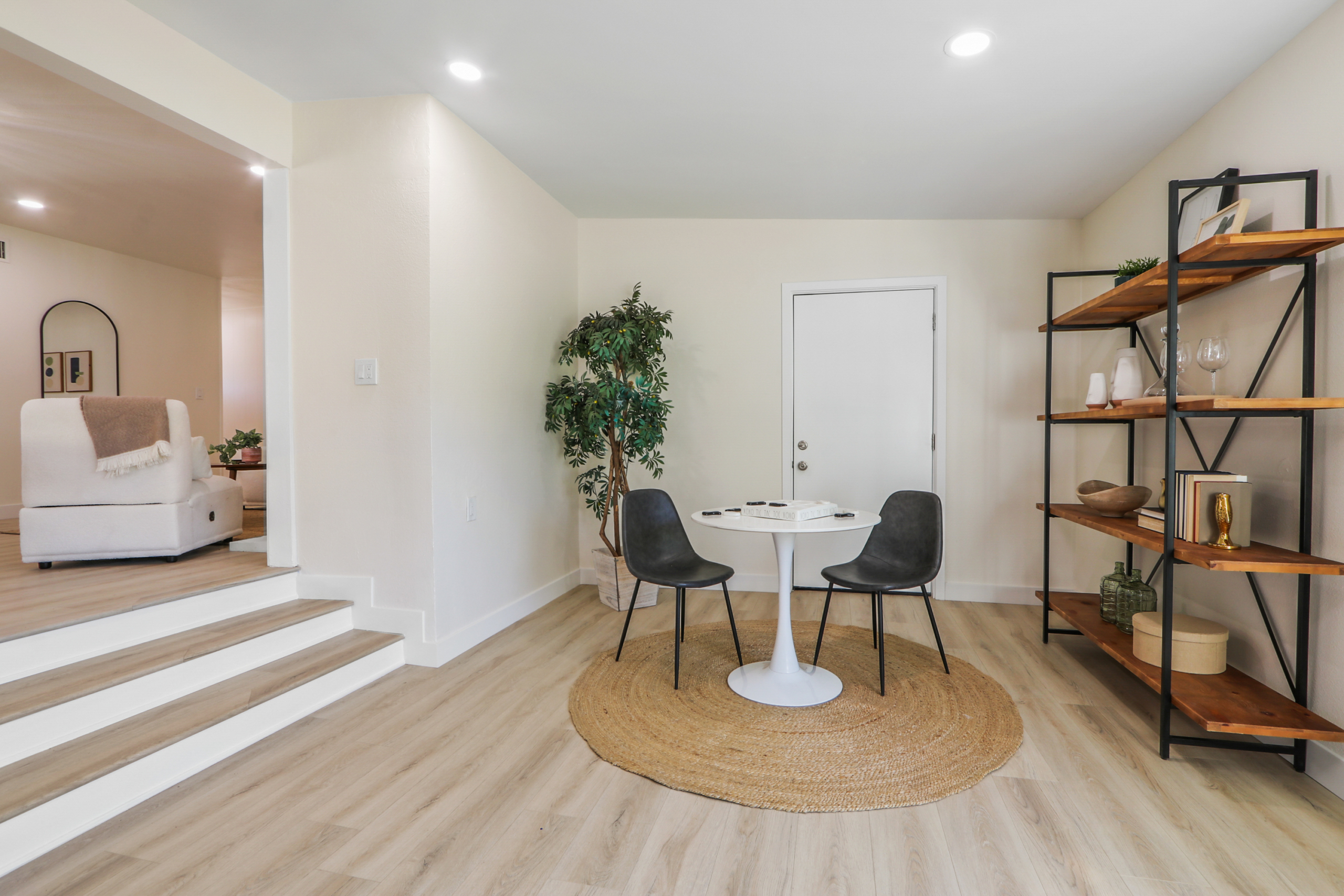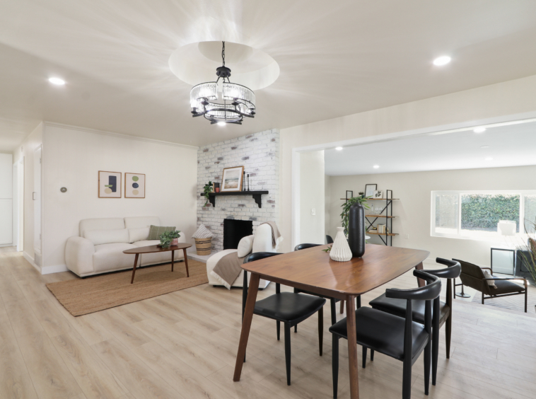 open floor plan, an upgraded kitchen with new cabinets, quartz countertops, and appliances, tastefully remodeled